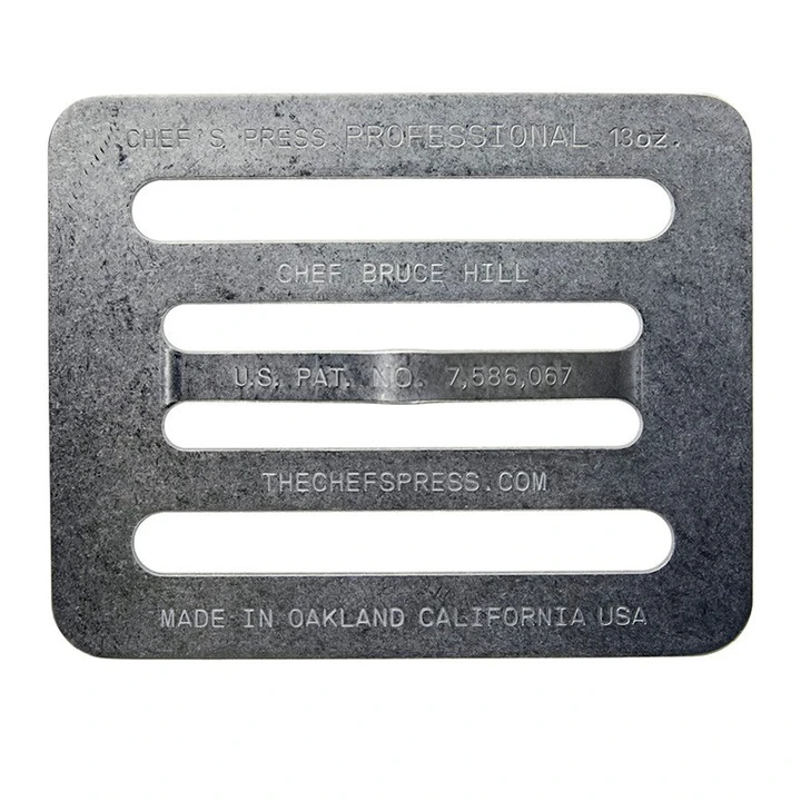 Gebruik Chef’s Press op steaks, bacon, burgers, sandwiches en nog veel meer tijdens het grillen, om een gelijkmatige garing te krijgen!