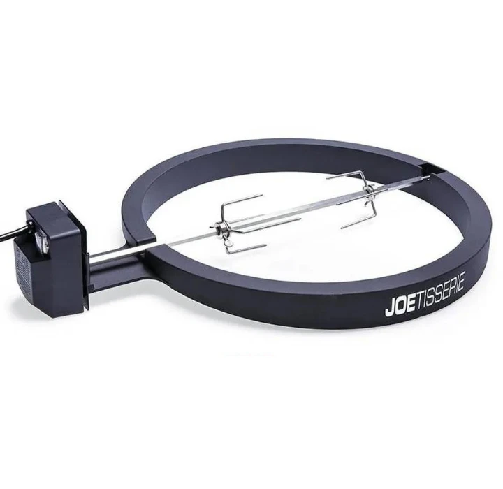 De Joe Tisserie, gemaakt van duurzaam gegoten aluminium, maakt van de Kamado Joe Classic een een complete draaispit oven. Het vlees draait rond binnen de hoogwaardig keramische wanden van de Kamado Joe, waardoor alle sappen bewaard blijven. Het vlees krijgt een heerlijke rooksmaak en blijft mals. De stille elektromotor is krachtig genoeg om het spit aan te drijven compleet met een kip, riblappen of varkensschouder tot een gewicht van 22,5 kg.