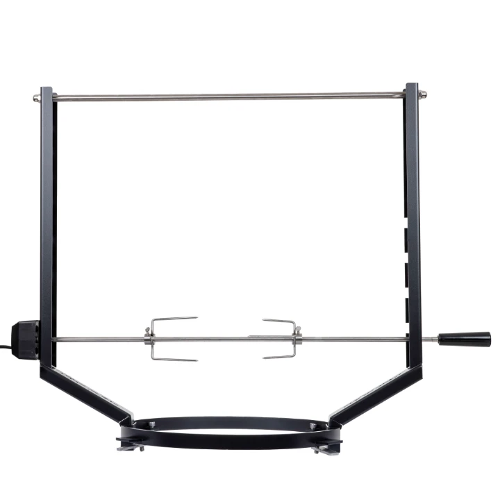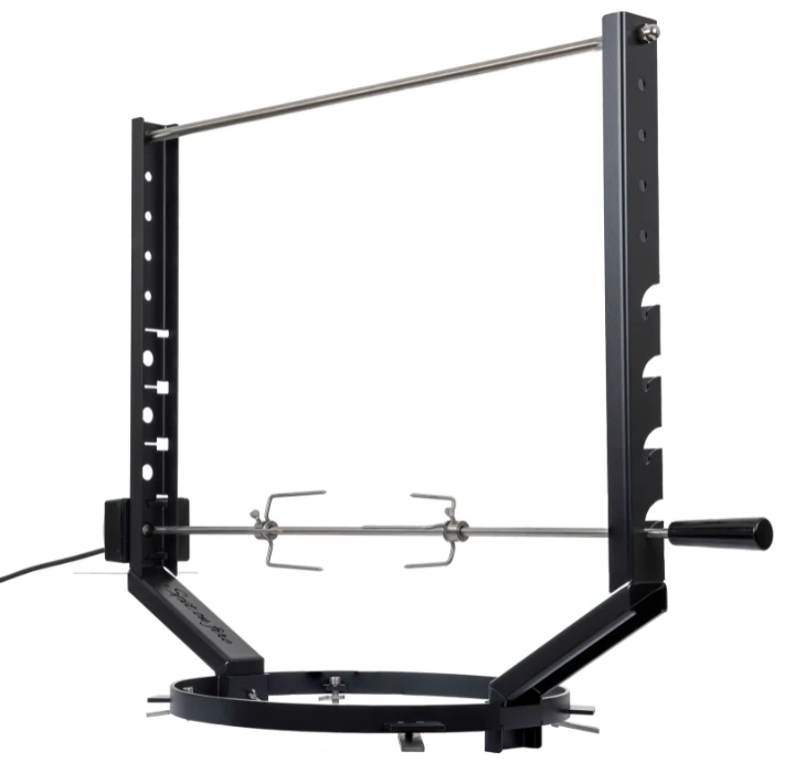 The Spit on Fire Ring is een rotisserie die geschikt is voor alle vuurschalen met een buiten diameter van 100 cm en een binnen diameter van 50 cm. De rotisserie bestaat uit een RVS gepoedercoate zwarte Ring en RVS gepoedercoate steunen. Daarbij een RVS Spit en een elektrische motor die tot 18 kilo aankan. The Spit on Fire Ring past perfect in het midden van de van de vuurschaal, zodat u perfecte gebakken kip, kalkoen, kebab, worstjes en ander vlees boven op vuur kan bereiden. Deze Spit on Fire Ring past op de volgende merken: Ofyr, Quoco